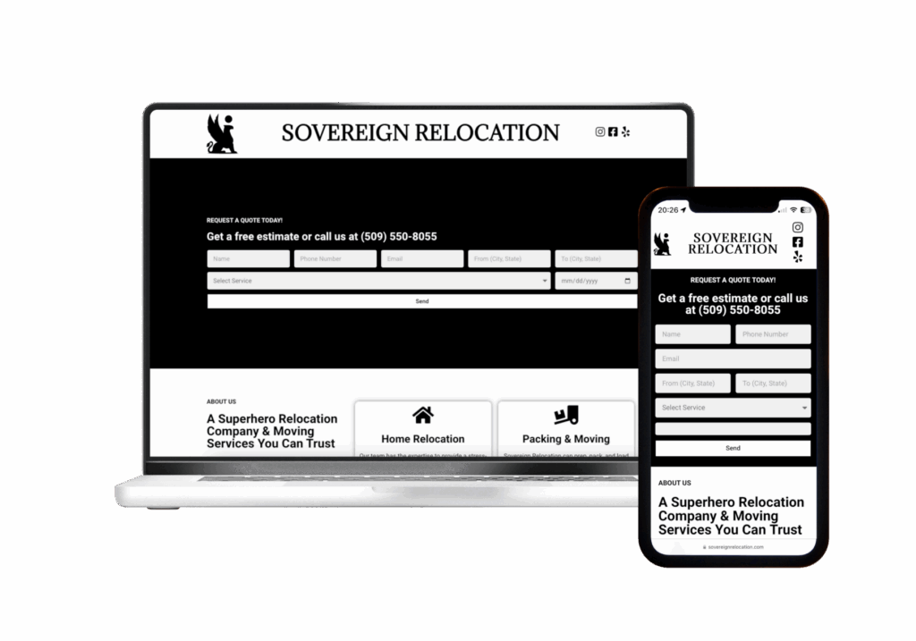 Sovereign Relocation is a moving company based out of Phoenix, AZ with other locations around the US. This is a one-page site designed to capture lead information through the contact form and promote their business services. They wanted a simple, clean layout and provided the logo and desired colors. Sovereign